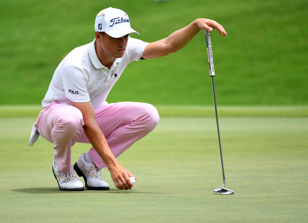 Justin Thomas lines up his putt on the first green during the final round of the WGC – FedEx St. Jude Invitational at TPC Southwind. (Christopher Hanewinckel – USA TODAY Sports)